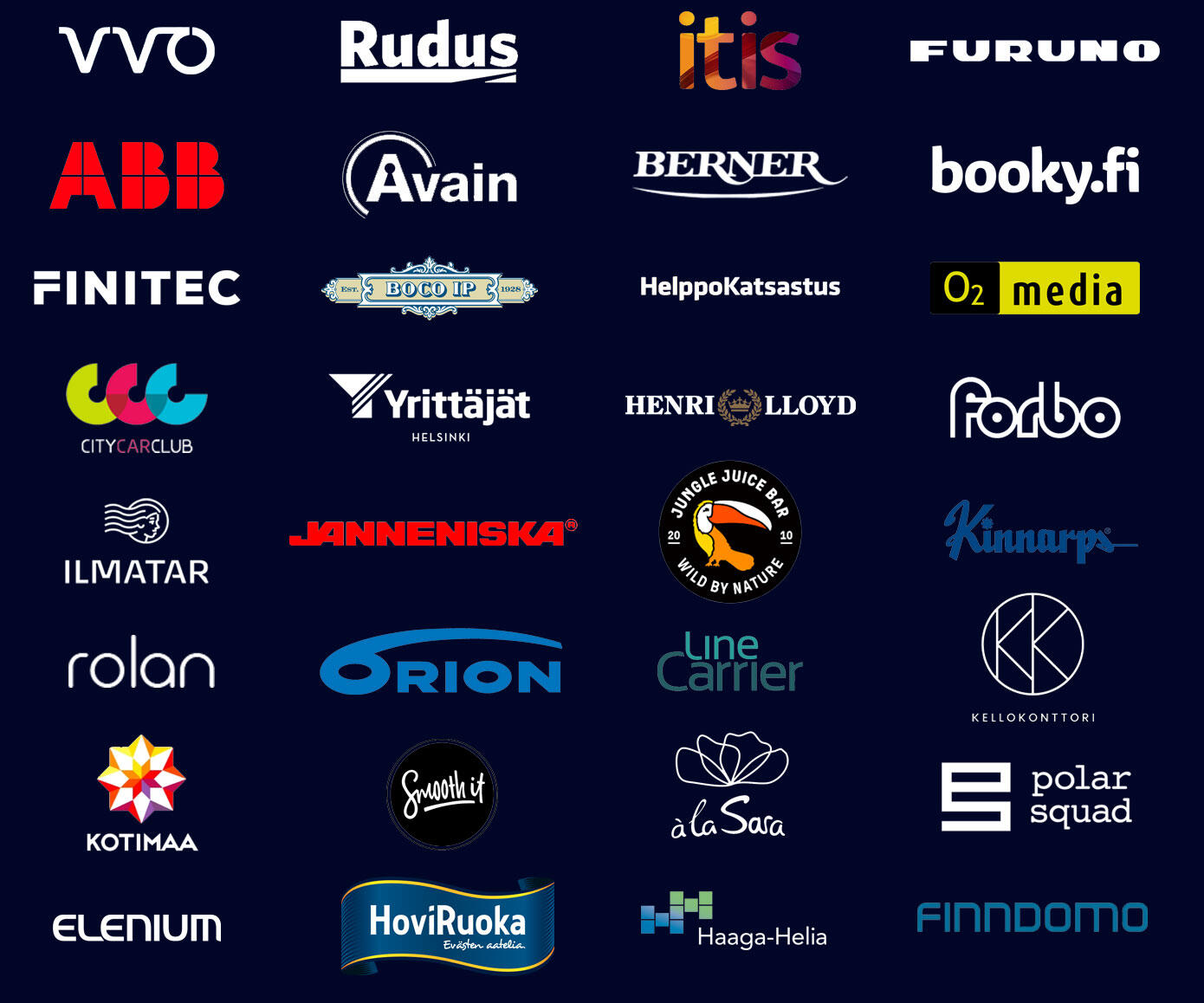 Minulla on vuosien varrella ollut suuri etuoikeus työskennellä useiden alansa parhaiden yritysten kanssa. Kokemusta löytyy siis 200+ asiakkaasta ja lähes kaikilta päätoimialoilta.Asiakkaiden kirjo on vaihdellut startupeista keskisuuriin yrityksiin ja edelleen pörssiyhtiöihin. Tässä muutama valikoitu asiakas.
